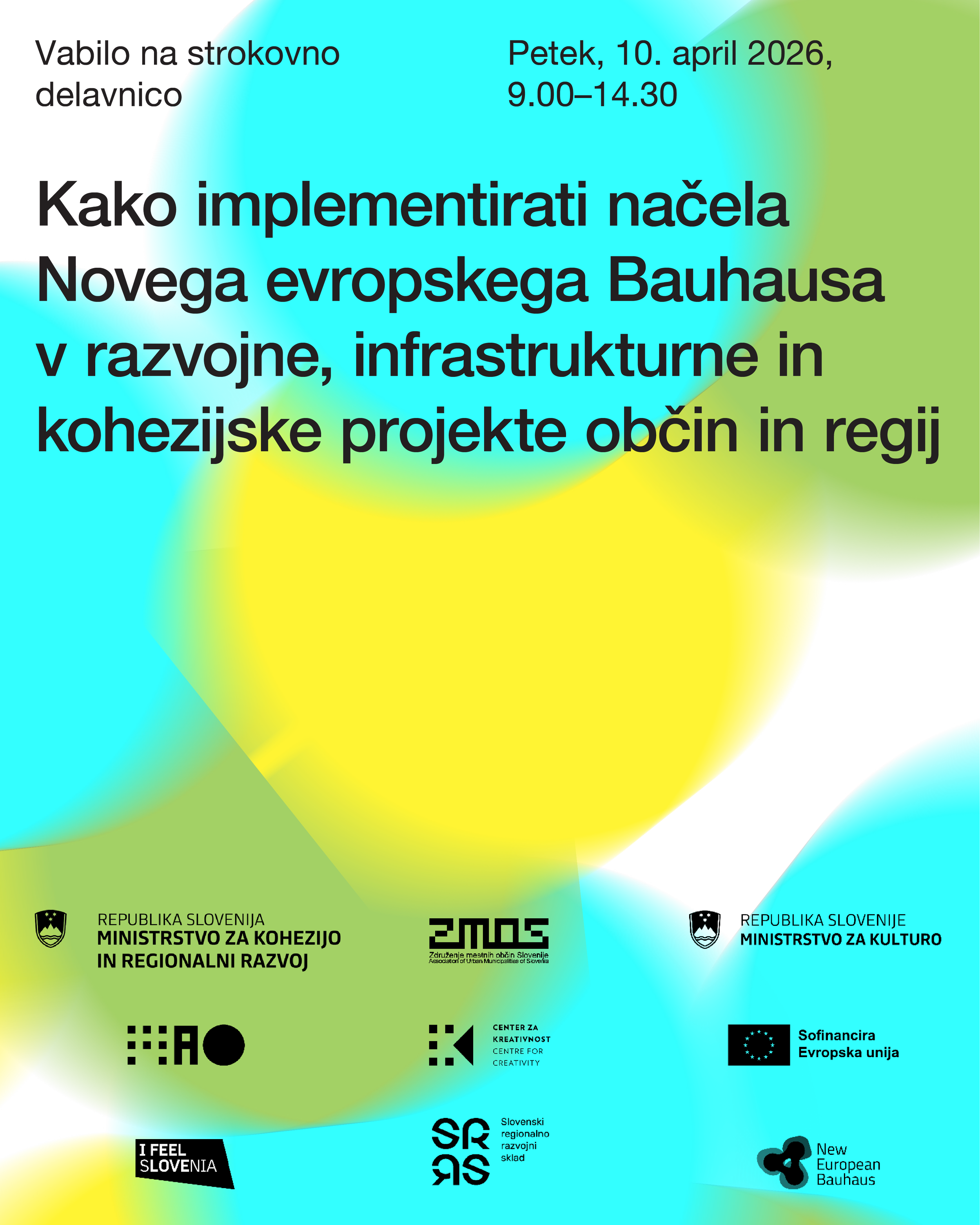 V sklopu izvajanja aktivnosti nacionalne kontaktne točke Novega evropskega Bauhausa (NEB) vas Center za kreativnost (CzK) in Muzej za arhitekturo in oblikovanje, skupaj z Ministrstvom za regionalni razvoj in kohezijo, Slovenskim regionalnim razvojnim skladom (SRRS), Ministrstvom za kulturo in Združenjem mestnih občin Slovenije (ZMOS), vabimo na strokovno delavnico Kako implementirati načela Novega evropskega Bauhausa v razvojne, infrastrukturne in kohezijske projekte občin in regij. Delavnica bo potekala v petek, 10. aprila 2026, med 9.00 in 14.30 v Muzeju za arhitekturo in oblikovanje.